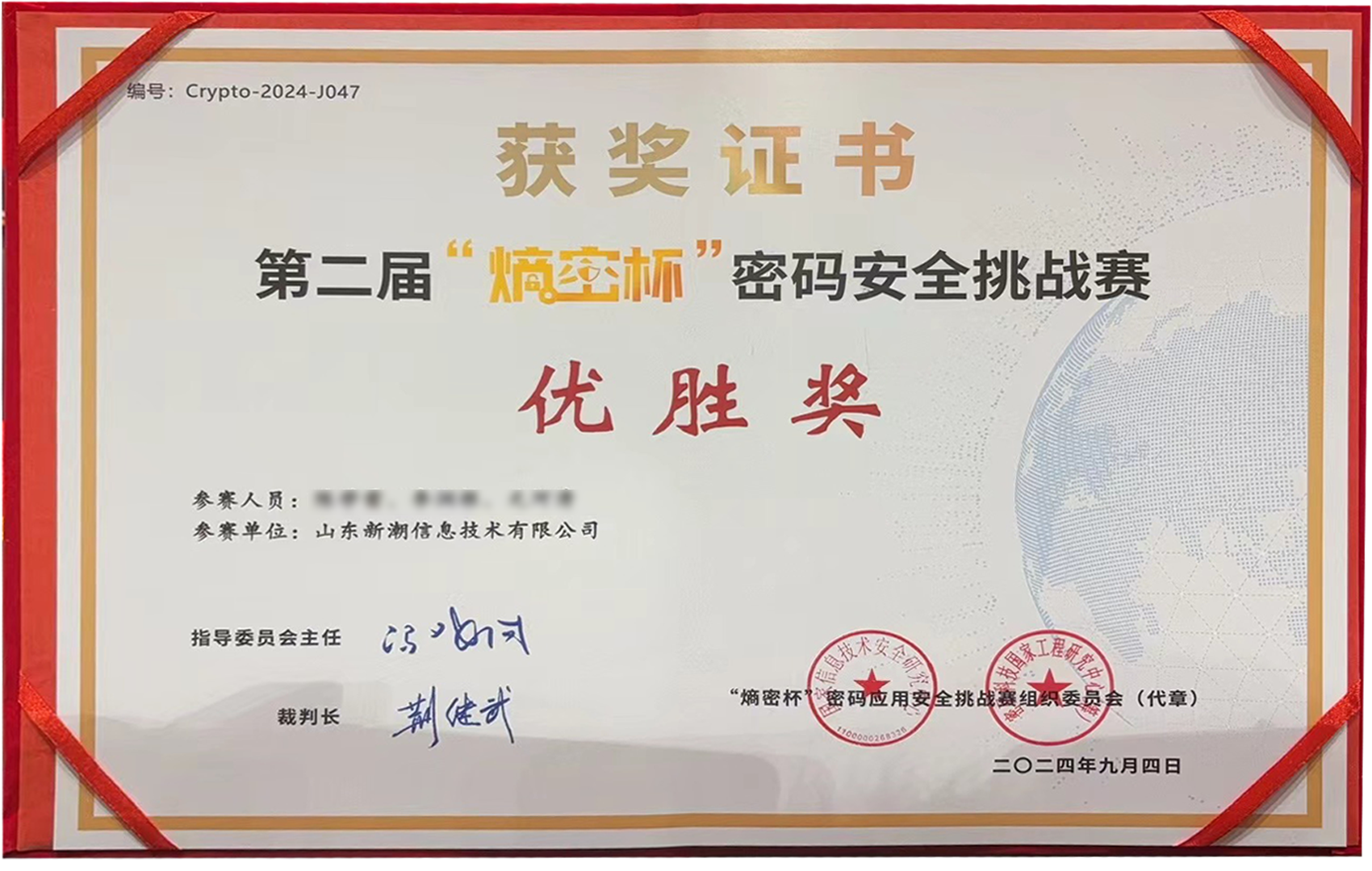 喜報|新潮信息榮獲第二屆“熵密杯”密碼安全挑戰(zhàn)賽優(yōu)勝獎!