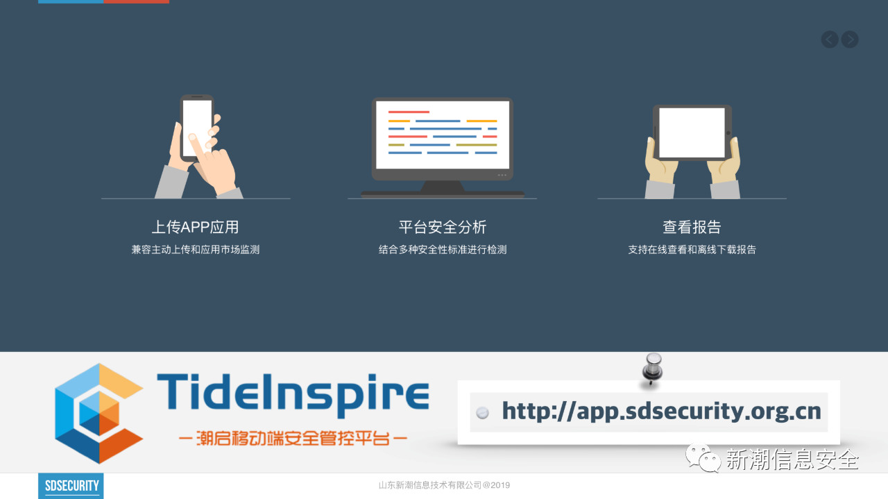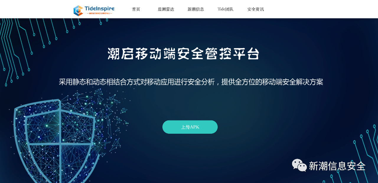 由于網(wǎng)絡(luò)安全等級保護(hù)制度2.0體系中對于移動互聯(lián)安全提出了專項擴(kuò)展要求,新潮信息配合網(wǎng)絡(luò)安全監(jiān)管機(jī)構(gòu)推出了“潮啟移動端安全管控平臺”,App開發(fā)運營機(jī)構(gòu)可以自主上傳移動端應(yīng)用程序,通過多引擎的檢測分析,了解移動端程序的安全狀況。