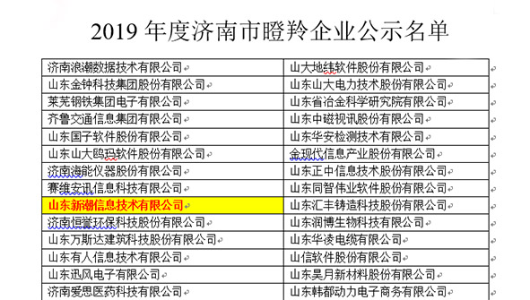 2019年8月,新潮信息被認定為2019年度濟南市級瞪羚企業(yè)