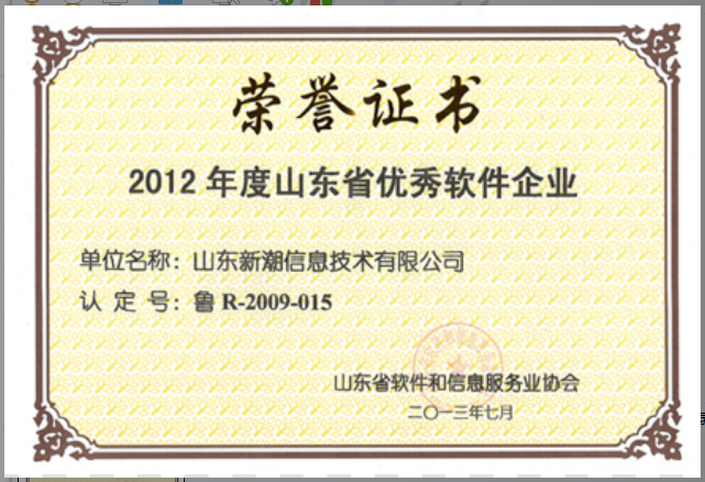 熱烈祝賀我公司獲得由山東省軟件和信息服務(wù)業(yè)協(xié)會頒發(fā)的2012年度山東省優(yōu)秀軟件企業(yè)榮譽證書。
