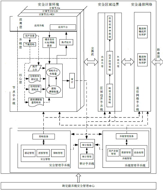 第三級系統(tǒng)安全保護環(huán)境設計示例:根據(jù)“一個中心”管理下的“三重保護”體系框架,構(gòu)建安全機制和策略,形成定級系統(tǒng)的安全保護環(huán)境。該環(huán)境分為如下四部分:安全計算環(huán)境、安全區(qū)域邊界、安全通信網(wǎng)絡和安全管理中心。每個部分由1個或若干個子系統(tǒng)(安全保護部件)組成,子系統(tǒng)具有安全保護功能獨立完整、調(diào)用接口簡潔、與安全產(chǎn)品相對應和易于管理等特征。安全計算環(huán)境可細分為節(jié)點子系統(tǒng)和典型應用支撐子系統(tǒng);安全管理中心可細分為系統(tǒng)管理子系統(tǒng)、安全管理子系統(tǒng)和審計子系統(tǒng)。