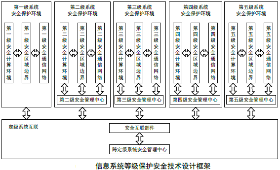 信息系統(tǒng)等級保護安全技術(shù)設計包括各級系統(tǒng)安全保護環(huán)境的設計及其安全互聯(lián)的設計。各級系統(tǒng)安全保護環(huán)境由相應級別的安全計算環(huán)境、安全區(qū)域邊界、安全通信網(wǎng)絡和(或)安全管理中心組成。定級系統(tǒng)互聯(lián)由安全互聯(lián)部件和跨定級系統(tǒng)安全管理中心組成。